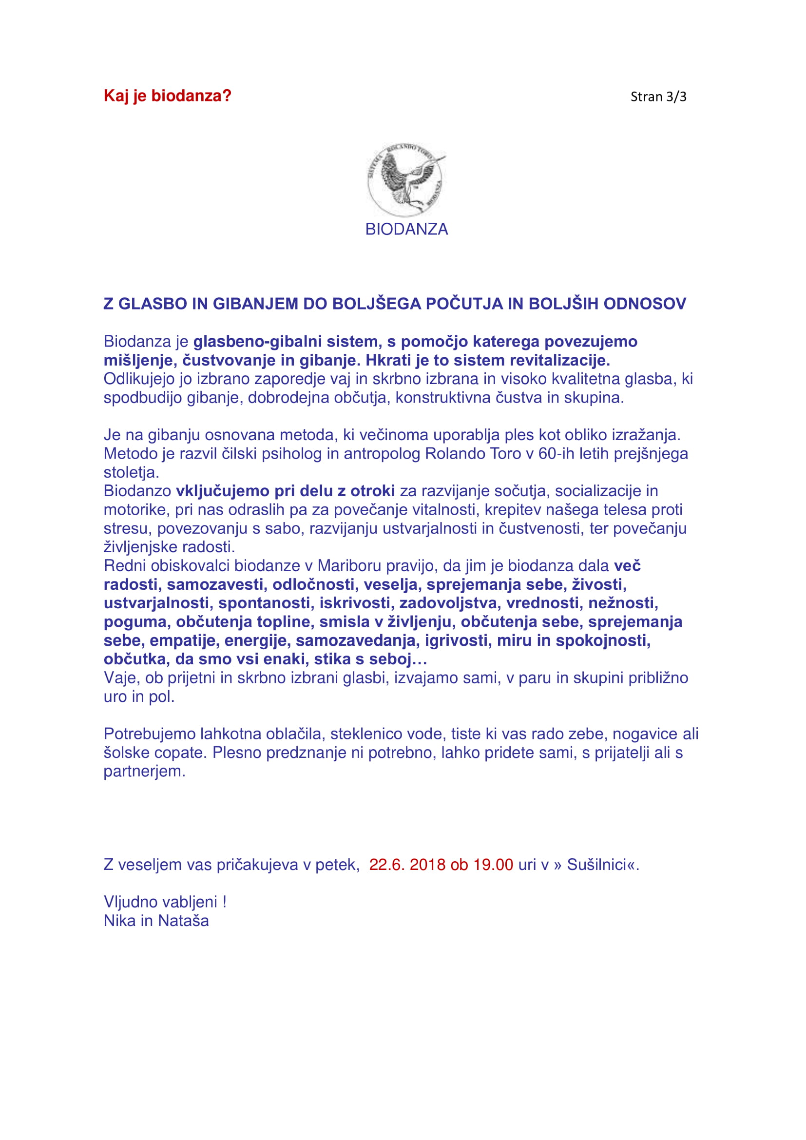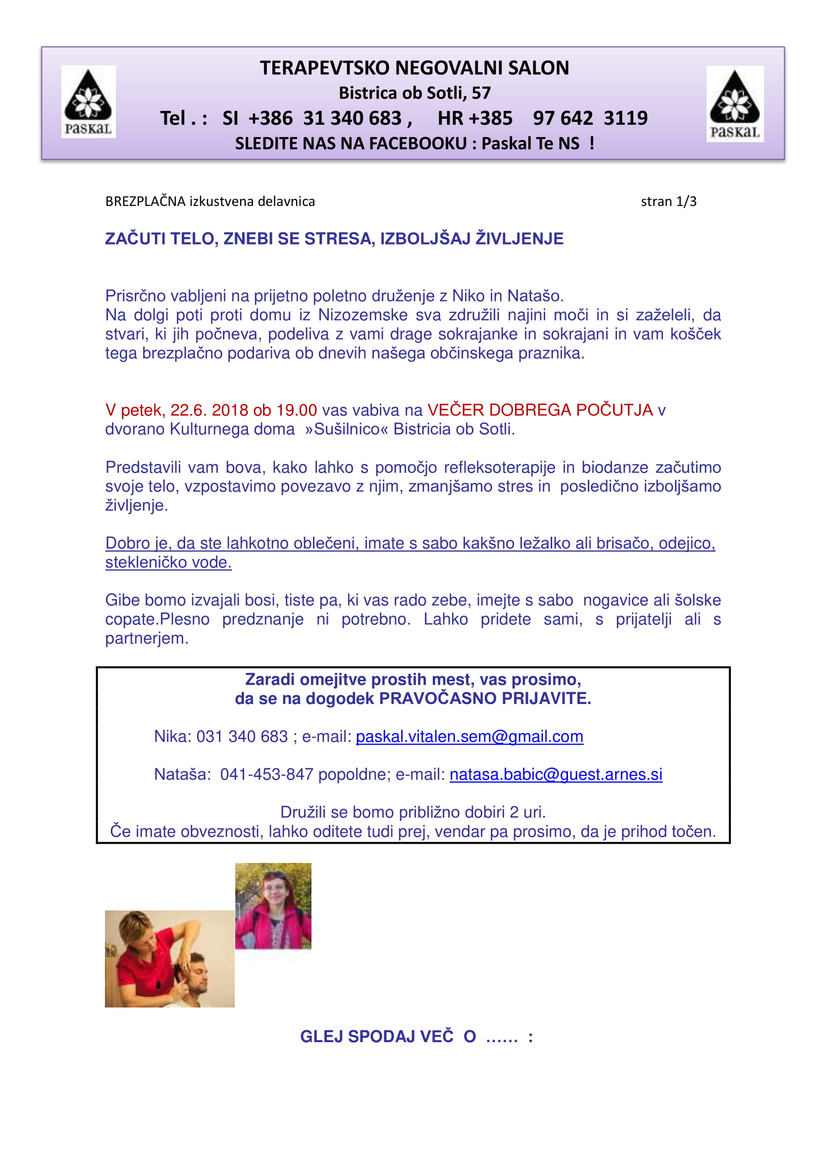 BREZPLAČNA izkustvena delavnica s kratko predstavitvijo, vajami refleksoterapije in plesnimi gibi Biodanza , s katerimi bomo izboljšali povezavo s svojim telesom. Gostja Nataša Babič, vaditeljica Biodanze. Organizira: Terapevtsko negovalnega salona PASKAL, Bistrica ob Sotli,
