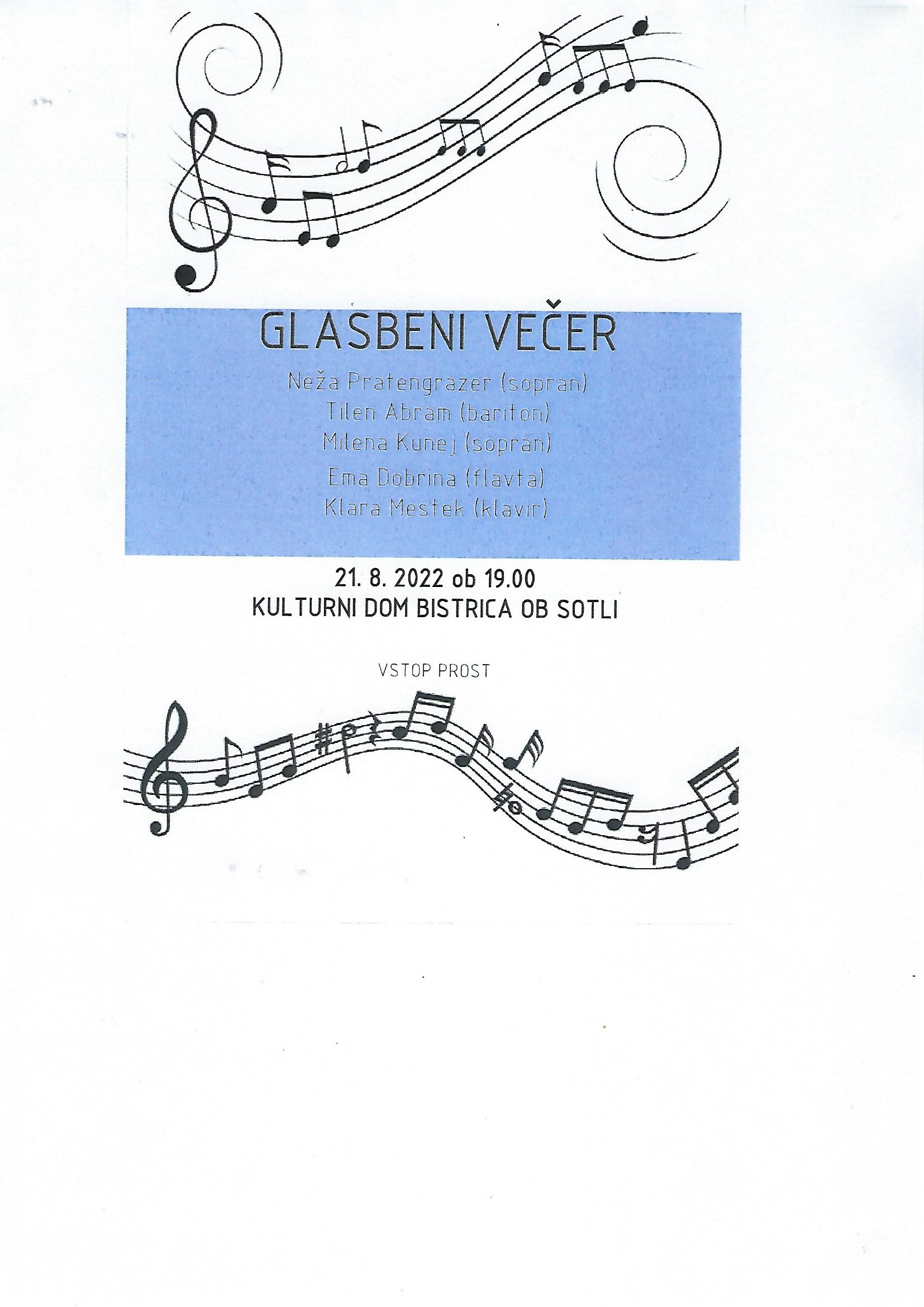 Turistično društvo Bistrica ob Sotli s Kulturnim društvom Bistrica ob Sotli organizira GLASBENI VEČER.