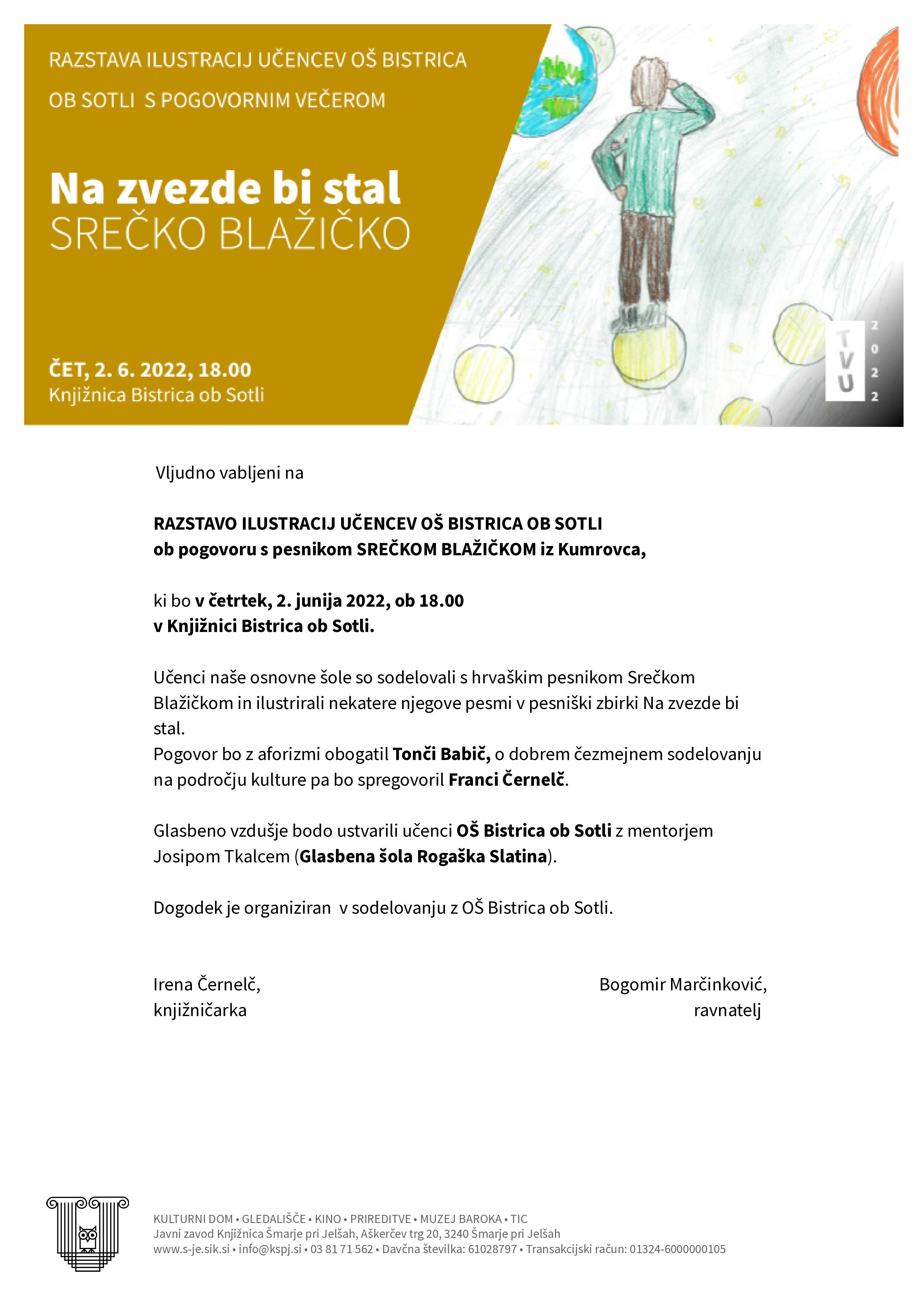 RAZSTAVA ILUSTRACIJ UČENCEV OŠ BISTRICA OB SOTLI ob pogovoru s pesnikom SREČKOM BLAŽIČKOM iz Kumrovca