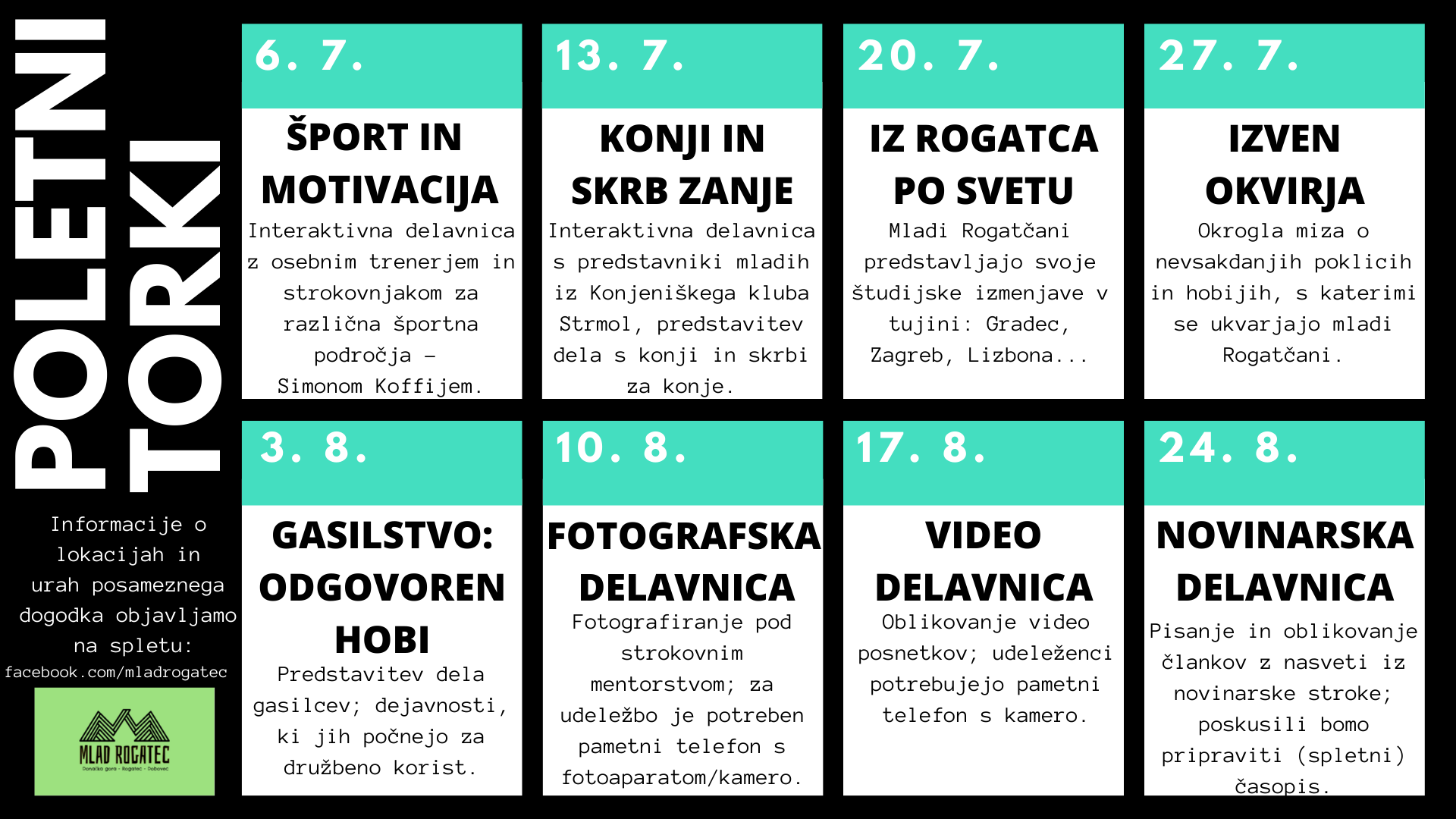Poletni torki sledijo kot bolj izobraževalno-ustvarjalno dogajanje skozi celo poletje. Redno se podrobnosti glede Poletnih torkov objavljajo na Facebook profilu Mlad Rogatec: MLAD ROGATEC – Domov | Facebook
