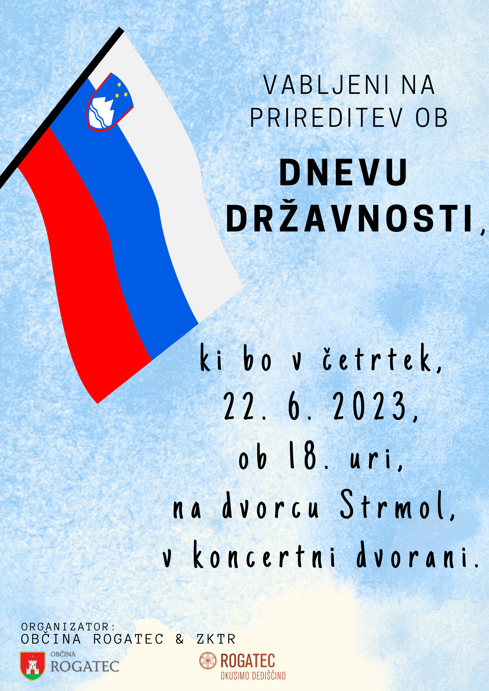 Občina Rogatec in ZKTR vabita na prireditev ob dnevu državnosti, ki bo 22. 6. 2023, ob 18. uri, na dvorcu Strmol, v koncertni dvorani.