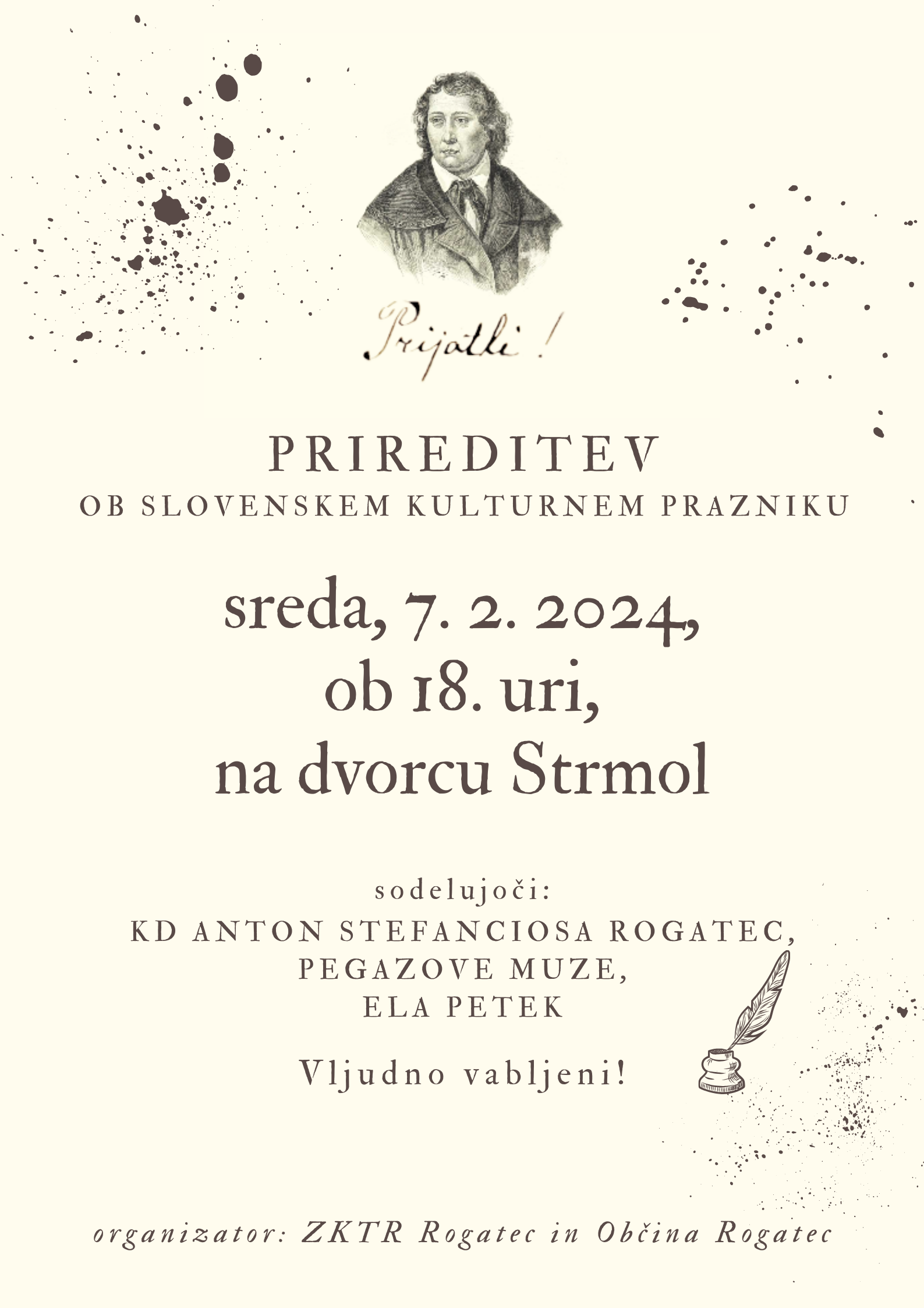 Vabljeni na prireditev ob slovenskem kulturnem prazniku, ki bo v sredo, 7. 2. 2024, ob 18. uri, na dvorcu Strmol.