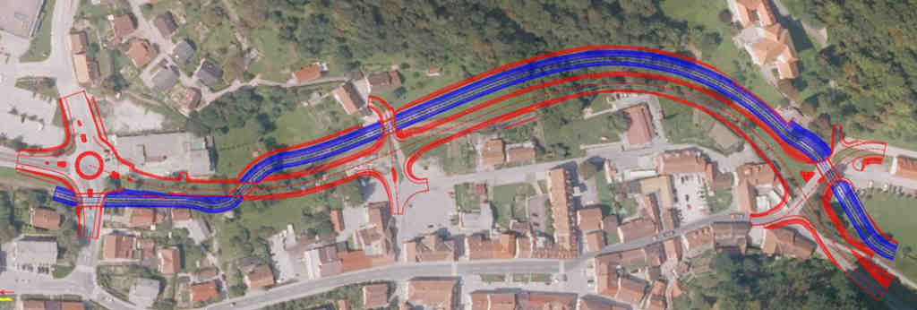 - dalje po obstoječih površinah od površine za pešce in kolesarje, preko Celjske ceste in R2 ( čez trg) do priključka k občinski stavbi v dolžini 802 m (prometna ureditev)