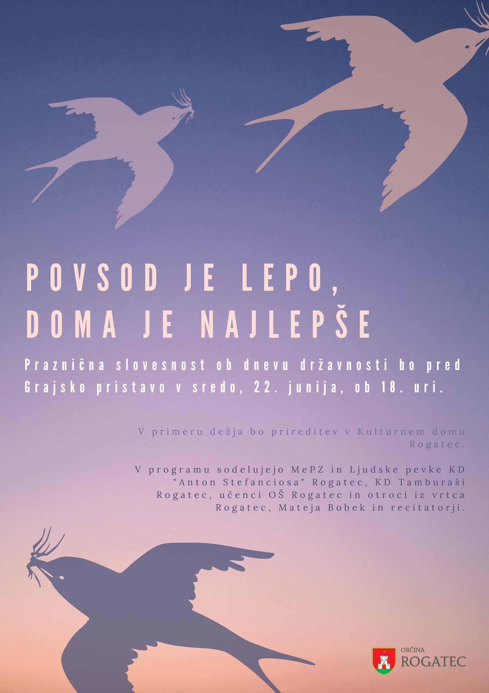 Vljudno vabljeni na praznično slovesnost ob dnevu državnosti, ki bo v sredo, 22. junija ob 18. uri, pred Grajsko pristavo.