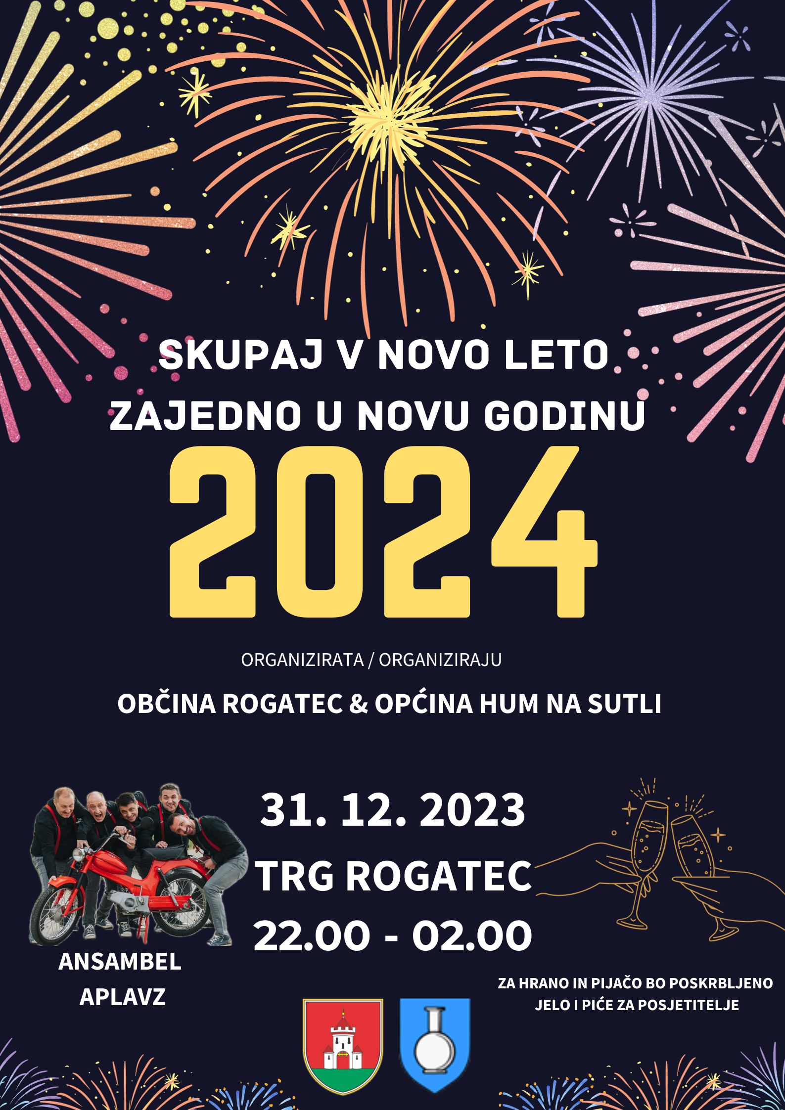 Na trgu v Rogatcu bo 31. 12. 2023, ob 22. uri, pričetek programa z Ansamblom Aplavz. Po skupni zdravici ob polnoči pa bomo s praznovanjem nadaljevali do 2. ure zjutraj!