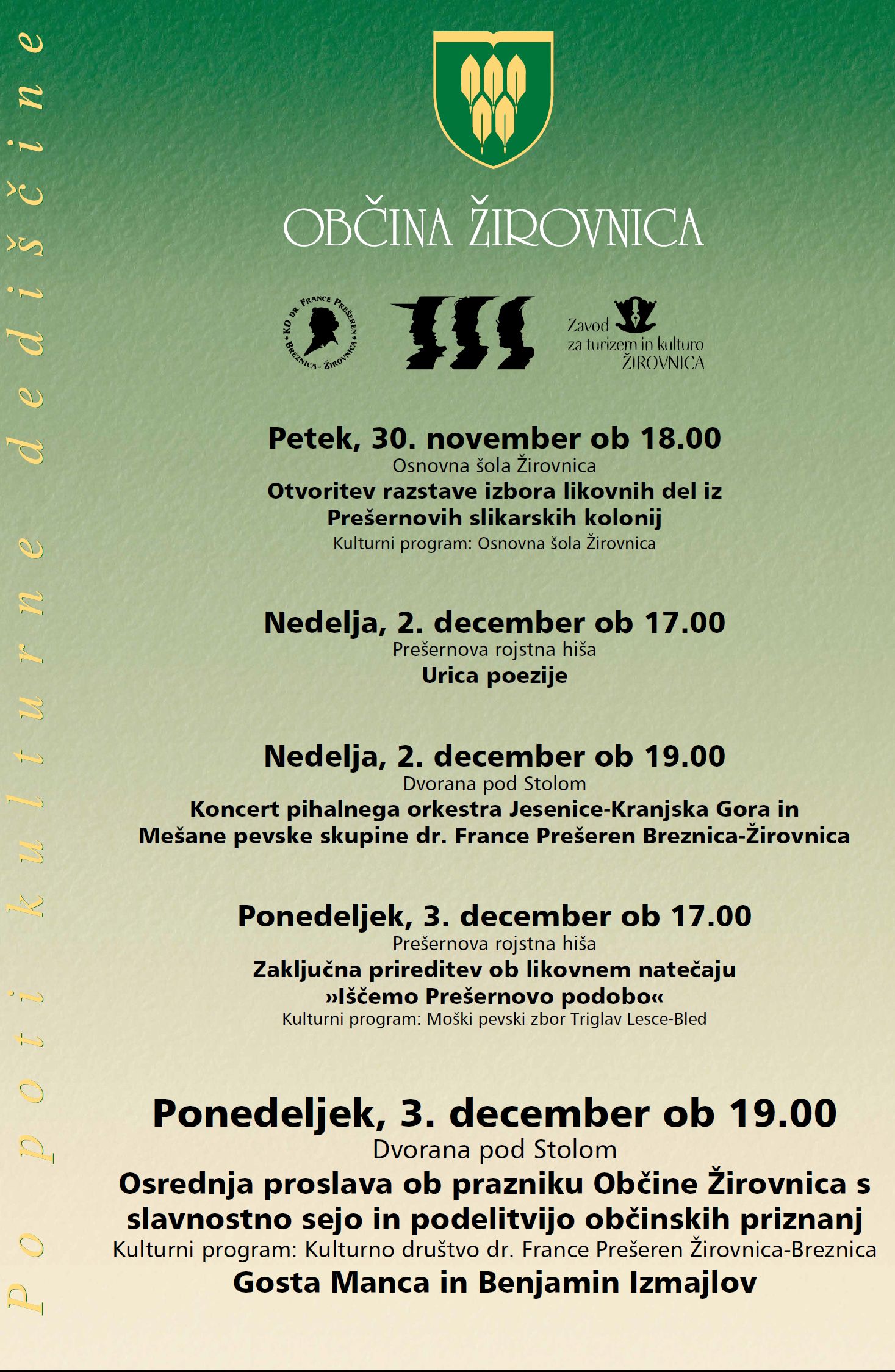 Vabimo vas, da se udeležite prireditev ob 3. decembru, prazniku Občine Žirovnica. Še posebej vabljeni na osrednjo občinsko proslavo, ki bo v ponedeljek, 3.decembra ob 19.00 uri, v Dvorani pod Stolom.