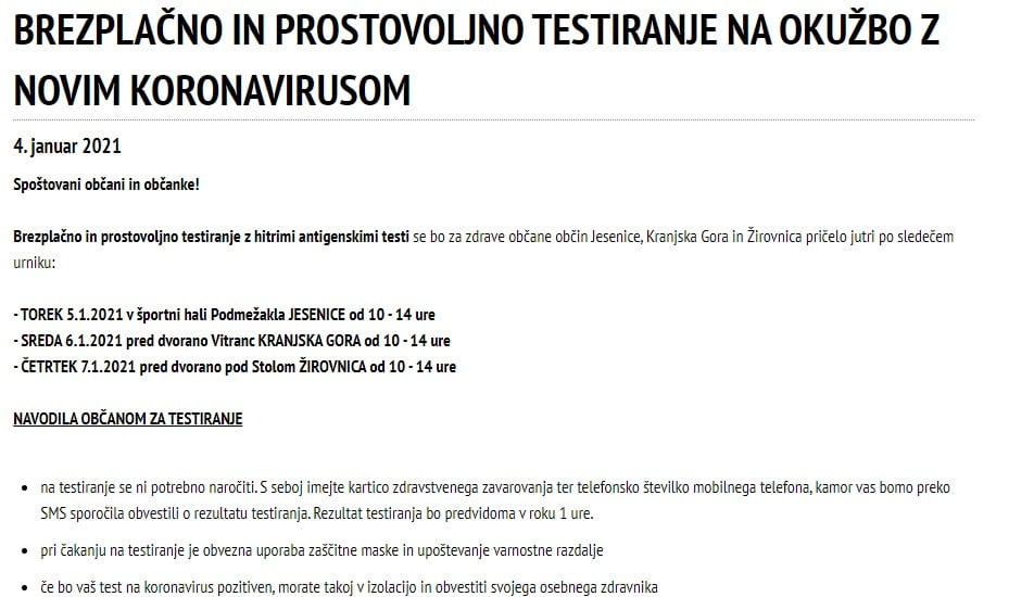 Brezplačno in prostovoljno testiranje na okužbo z novim koronavirusom-obvestilo