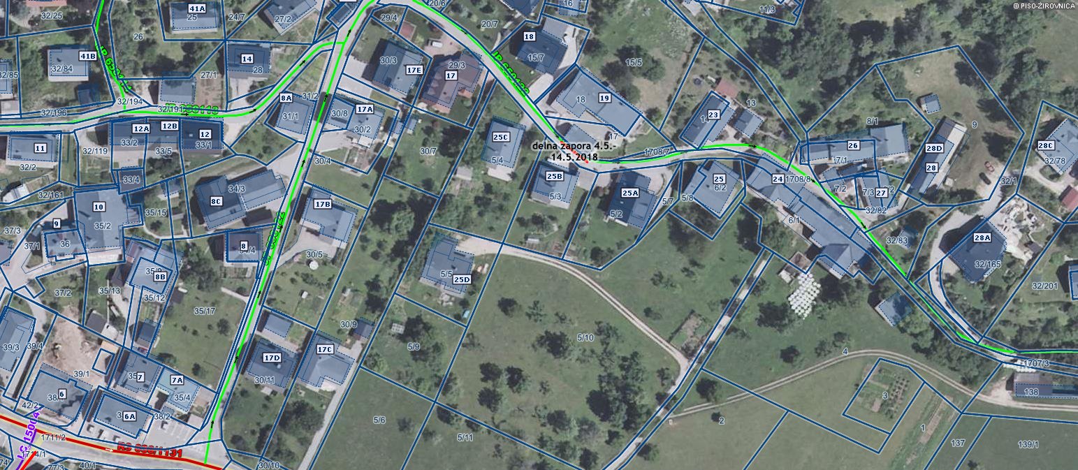 Čadež Erik, Breznica 19, 4274 Žirovnica, je dne 03.05.2018 zaradi izvedbe fasade na garaži od petka, dne 04.05.2018, do ponedeljka, dne 14.05.2018, zaprosil za delno zaporo kategorizirane občinske ceste s parc. št. 1708/8 k.o. Doslovče in oznako JP 650122, pri stanovanjskem objektu Breznica 19. Delna zapora na cesti bo trajala v času zapore vsak dan od 0.00 do 24.00 ure.