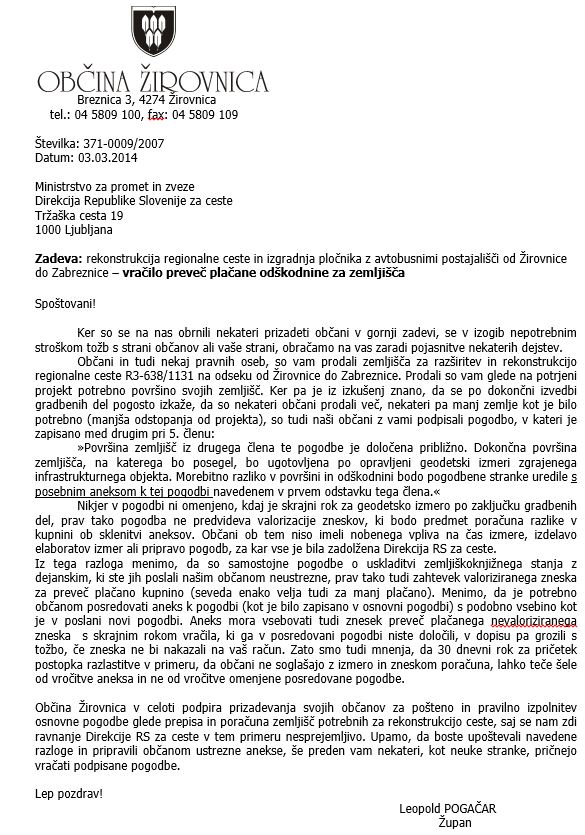 To je bil projekt, ki ga je sofinancirala tudi občina Žirovnica (49%), ker smo z rekonstrukcijo ceste gradili tudi pločnik in avtobusna postajališča. Občani so za prodana zemljišča prejeli plačilo, v pogodbah pa so imeli sicer korektno zapisano, da se končni poračun uredi po odmeri zemljišč in vpisu v zemljiško knjigo ter, da se preveč plačana sredstva s strani prodajalcev (občanov) takrat vrne. Vse lepo in prav do danes, ko je DRSC potrebovala nekaj let, da je stvari uredila (odmera, vpisi v ZK….), sedaj pa od občanov zahteva vrnitev sredstev z revalorizacijo, za vsa ta leta preplačila. Ravno revalorizacija je sporna, saj država terja (obresti) od ljudi za njene nerazumno dolge postopke, na katere pa ljudje niso imeli prav nobenega vpliva. To je še en dokaz kako ozko birokratsko se nekatere zadeve rešujejo pri nas. Ker nihče od občanov ni imel vpliva na hitrost urejanja zemljiškoknjižnih zadev, niti ni kriv za nerazumno dolge postopke države, po našem mnenju ni osnove za takšne revalorizirane zahtevke.