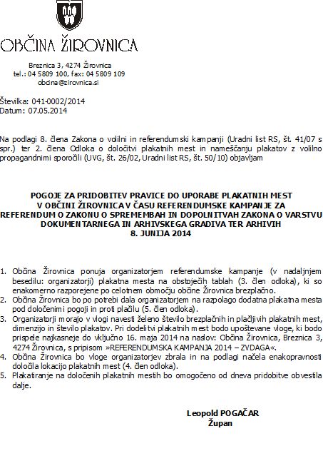 Javni razpis plakatnih mest za referendum o Zakonu o spremembah in dopolnitvah Zakona o varstvu dokumentarnega in arhivskega gradiva ter arhivih – drugič