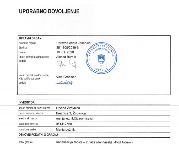 Občina dobila uporabno dovoljenja za novozgrajeno kanalizacijo v zgornjih Mostah – obvestilo