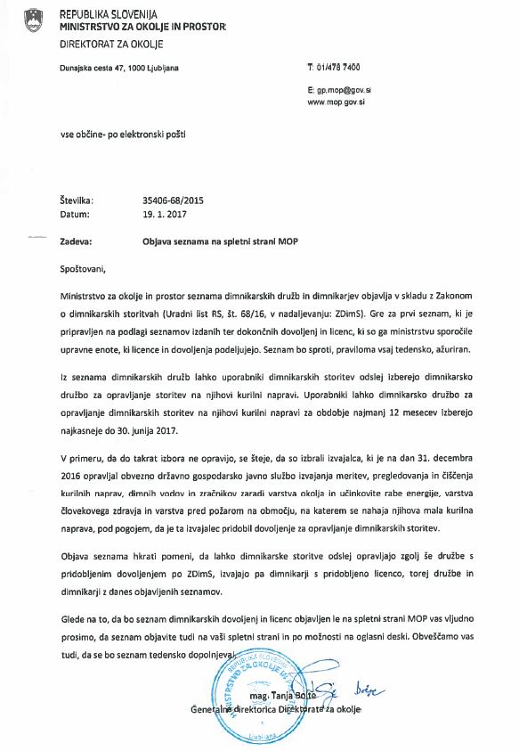 Objava seznama dimnikarjev na spletni strain MOP-obvestilo