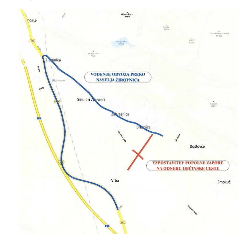 - Preusmeritev prometa bo urejena preko naselja Žirovnica in bo urejena z namestitvijo obvestilnih/obvoznih tabel ter znakov s smerjo obvoza.