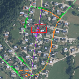 Cesta bo v času izvajanja del popolno zaprta. Ker se na območju zapore ceste nahaja avtobusno postajališče »Breg Žirov. star«, obveščamo, da bo v sredo in četrtek na tem območju kot zadnje in prvo avtobusno postajališče »Moste/Žirov. Bloki«, saj avtobus le na tem delu še lahko varno obrne. Za ostala vozila bo obvoz urejen preko občinskih kategoriziranih cest z oznako JP 650011 in JP 650018, kot je to z oranžno barvo označeno na skici.