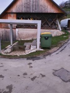 Ker v času zapore odseka ceste v vasi, zaradi izvajanja gradbenih del, smetarsko vozilo ne more priti do vseh odjemnih mest, je JEKO d.o.o. začasno postavil dva večja zabojnika pri pralnem koritu (slika spodaj). Oba zabojnika sta volumna 1100 l, eden za mešane komunalne odpadke in eden za odpadno mešano komunalno embalažo.