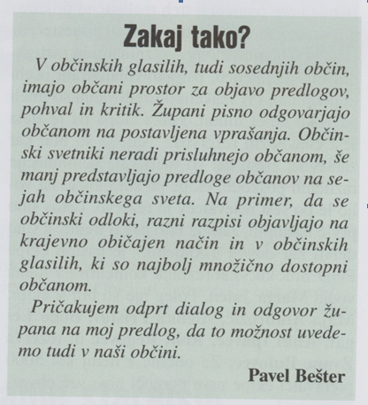 Vsak občan ima možnost v našem časopisu ali drugače zastaviti vprašanja meni-županu, župan pa na njih odgovarja. Zato je predvidena rubrika »mnenja,novice«. Okoli tega torej ne gre zgubljati besed.