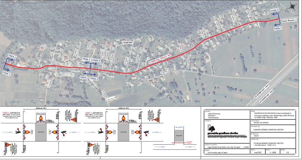 2. Popolna zapora ceste z oznako LC 150061 (faza 1 in faza 2) in vseh pripadajočih javnih poti ob LC 150061 (faza 3) bo trajala v omenjenem terminu od 0.00 do 24.00 ure.