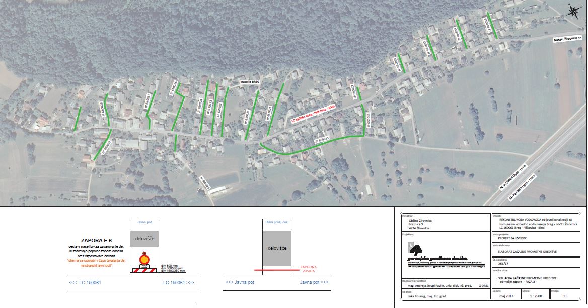 Gorenjska gradbena družba d.d., Jezerska cesta 20, 4000 Kranj, je dne 22.02.2018 zaradi dokončanja gradnje kanalizacijskega omrežja in izvedbe rekonstrukcije vodovoda v naselju Breg zaprosila za podaljšanje dovoljenja za prekop in popolno zaporo dela kategorizirane občinske ceste s parc. št. 1210/2 in 1189/1 obe k.o. Žirovnica z oznako LC 150061 in hkrati tudi vseh pripadajočih javnih poti ob LC 150061, do četrtka, dne 31.05.2018.