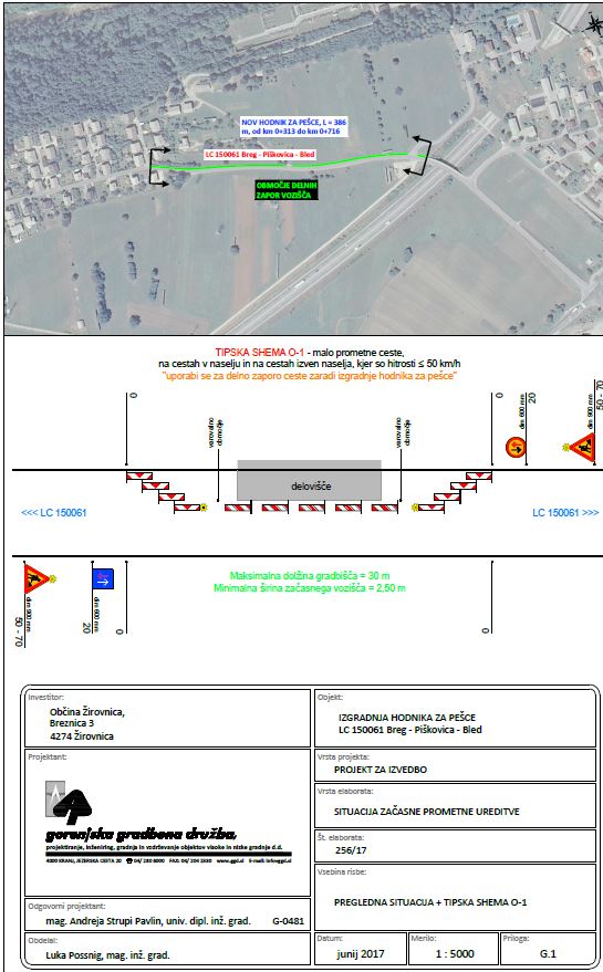 Dovoljenje št. 371-0036/2017 za delne zapore dela kategorizirane občinske ceste s parc. št. 1189/1 k.o. Žirovnica z oznako LC 150061 v terminu od srede, dne 17.01.2018, do srede, dne 28.02.2018, je bilo vlagatelju izdano 15.01.2018. Izvajalec z deli še ni zaključil, zato je dne 22.02.2018 pisno zaprosil za podaljšanje navedenega dovoljenja za delne zapore navedene ceste do 30.04.2018. Delne zapore bodo vzpostavljene v več etapah, pri tem bo maksimalna dolžina gradbišča (posamezna etapa) znašala cca 30 m. Začasna prometna ureditev bo urejena skladno s tipsko shemo z oznako O-1.