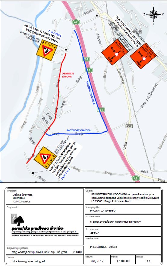 Gorenjska gradbena družba d.d., Jezerska cesta 20, 4000 Kranj, je dne 18.07.2018 zaradi podaljšanja gradnje za dokončanje kanalizacijskega omrežja in izvedbe rekonstrukcije vodovoda v naselju Breg zaprosila tudi za podaljšanje dovoljenja za prekop in popolno zaporo dela kategorizirane občinske ceste s parc. št. 1210/2 in 1189/1 obe k.o. Žirovnica z oznako LC 150061 in hkrati tudi vseh pripadajočih javnih poti ob LC 150061, do sobote, dne 29.09.2018.