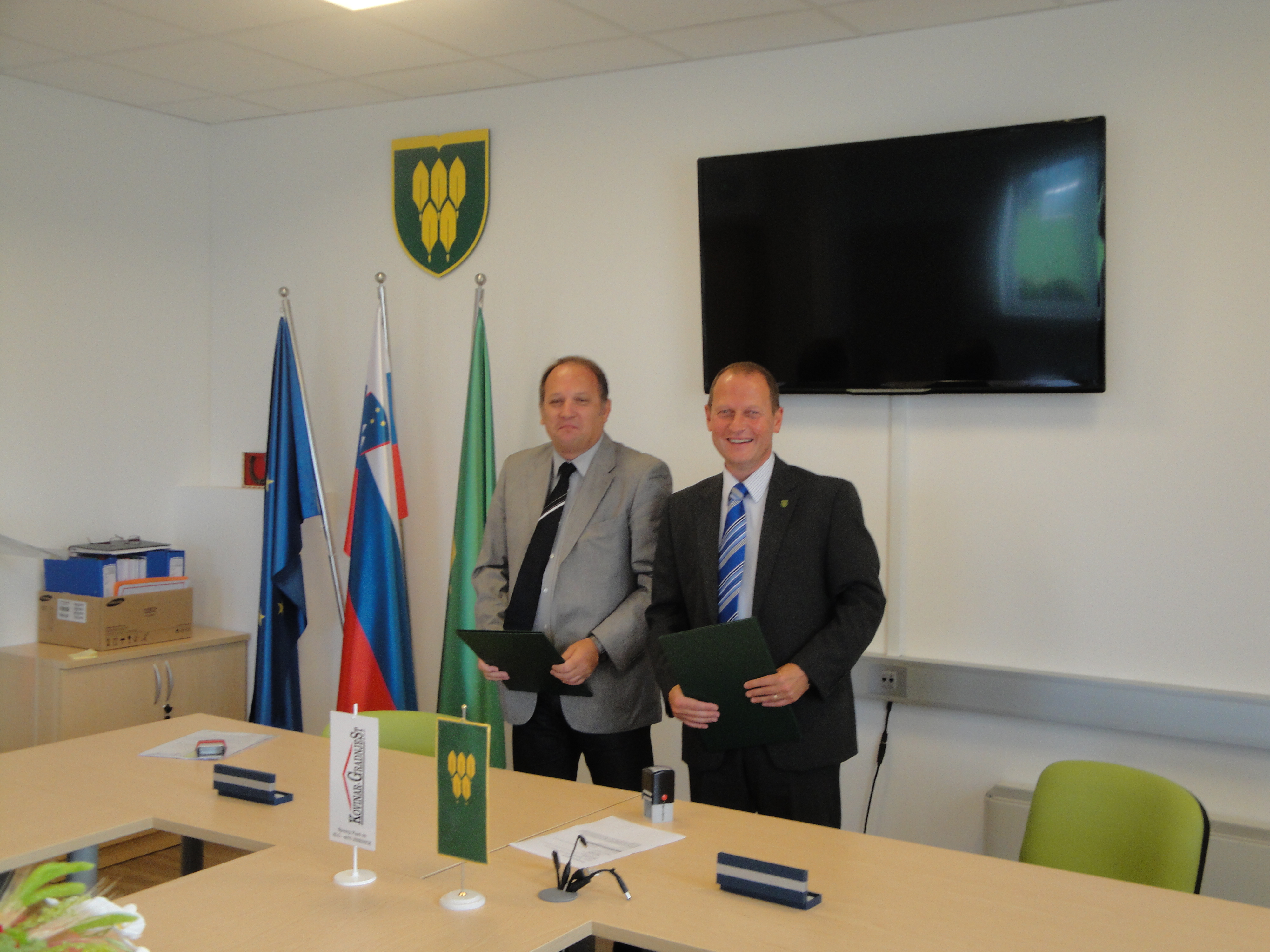 Na podlagi določb razpisne dokumentacije in obvestila o oddaji naročila, št. 430-0003/2014 z dne 25. 8. 2014 o izbiri najugodnejšega ponudnika javnega naročila gradnje po odprtem postopku za projekt “Rekonstrukcija in adaptacija obstoječega večstanovanjskega objekta na naslovu Selo 15, smo danes z izbranim izvajalcem, opravili podpis pogodbe o gradnji. Pogodbo sta podpisala župan občine Žirovnica g. Leopold Pogačar in Mirko Krašovec – direktor podjetja »Kovinar« gradnje ST. d.o.o.