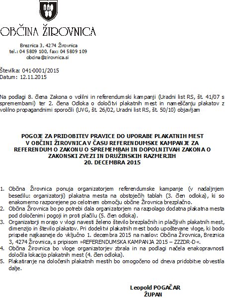 Pogoji za pridobitev pravice do uporabe plakatnih mest v Občini Žirovnica v času referendumske kampanje za referendum o Zakonu o spremembah in dopolnitvah zakona o zakonski zvezi in družinskih razmerjih, 20. decembra.2015
