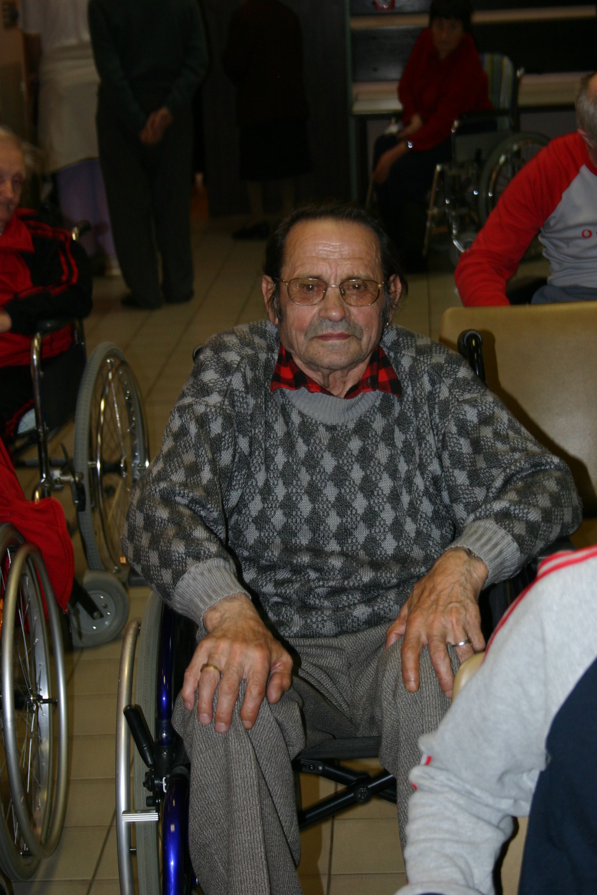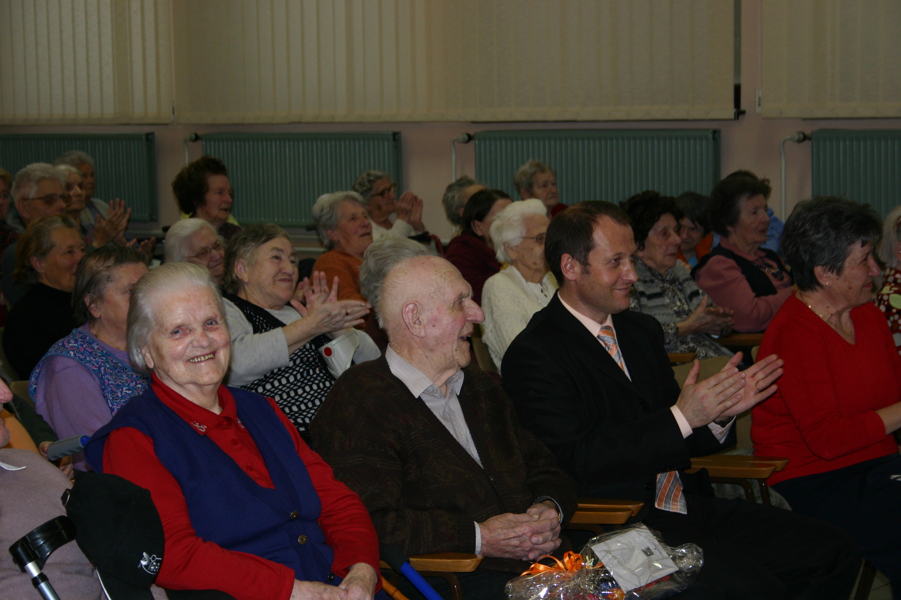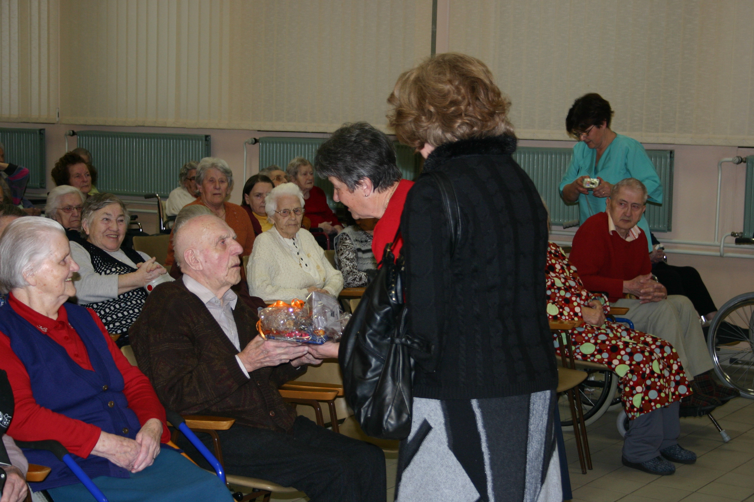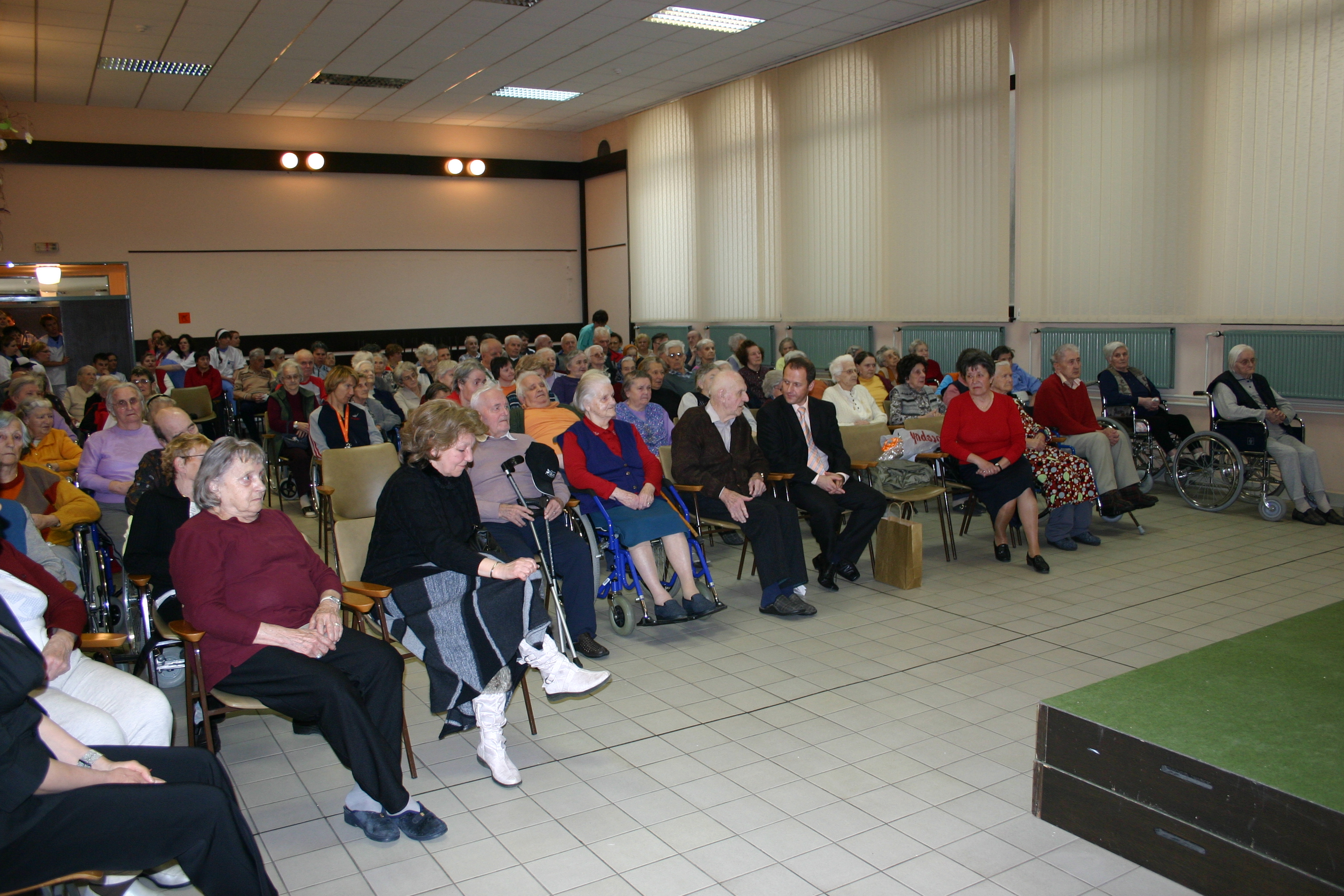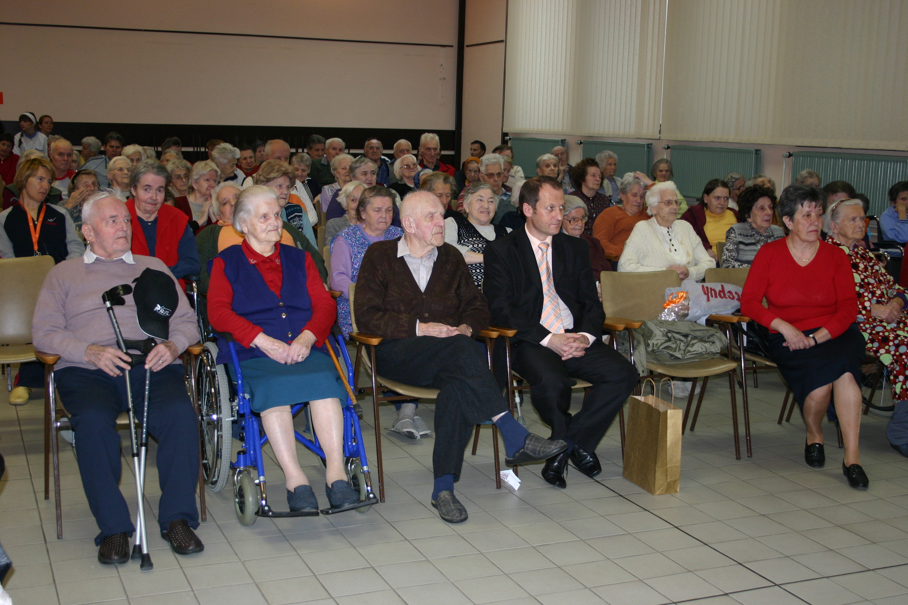 Ob prihodu so nas predstavniki doma pospremili do velike dvorane, kjer so nas polni pričakovanja čakali stanovalci doma, med katerimi so bili tudi naši občani.