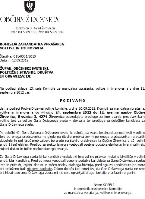 Poziv za posredovanje predlogov za imenovanje predstavnika v volilno telo za volitve člana Državnega sveta – elektorja ter predloge za določitev kandidata za člana Državnega sveta