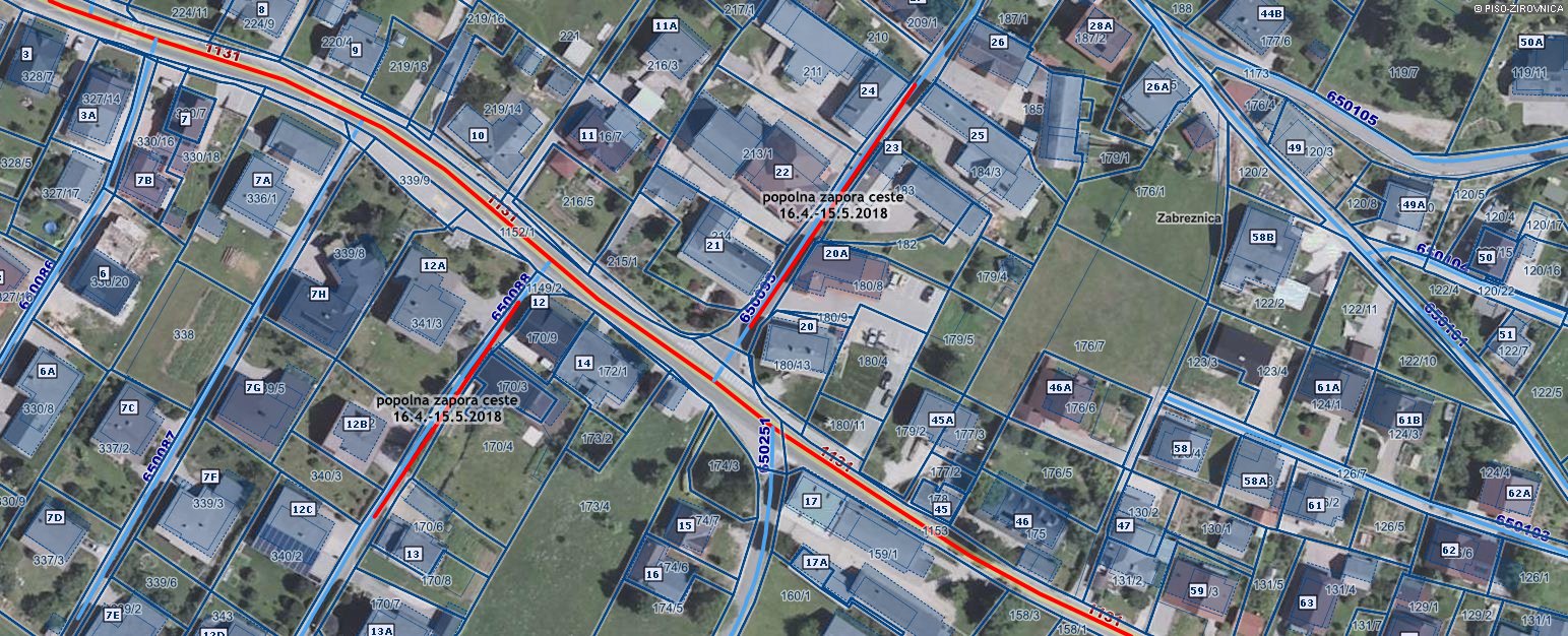 Občina Žirovnica dovoljuje Mapri Proasfalt d.o.o., Cesta dveh cesarjev 172, 1000 Ljubljana, zaradi sanacije kanalizacije v naselju Zabreznica, v času med ponedeljkom, dne 16.04.2018, in torkom, dne 15.05.2018, prekop in popolne zapore dela kategorizirane občinske ceste s parc. št. 1154/1 k.o. Zabreznica z oznako JP 650095 (od hišne št. Zabreznica 20 do 25) in kategorizirane občinske ceste s parc. št. 1149/2 k.o. Zabreznica z oznako JP 650088 (od hišne št. Zabreznica 12 do 13).