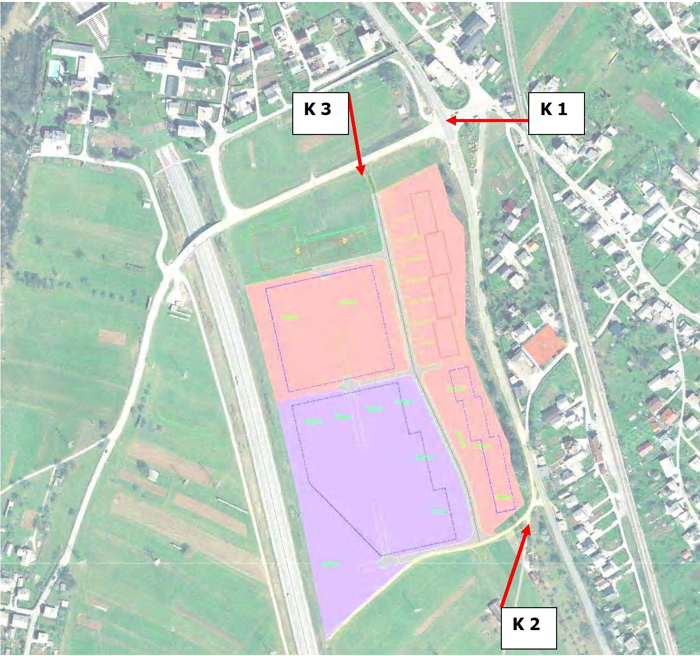 Pri kapacitetni analizi predvidenega stanja v letu 2020 smo analizirali navezavo poslovne cone na prometno omrežje s krožnim križiščem K1 (zaključek predhodno izdelane prometne študije), rekonstruiranim makadamskim priključkom K2 in novim trikrakim priključkom K3, ter dodatnimi generiranimi prometnimi obremenitvami ob polnem obratovanju poslovne cone.
