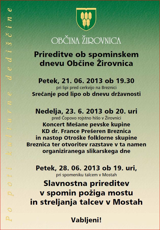 Vse vas vljudno vabim na prireditve, ki so razvidne iz priloženega programa in ki jih pripravljamo skupaj s KD F. Prešeren, ZB za vrednote NOB Žirovnica, OŠ Žirovnica in ostalimi.