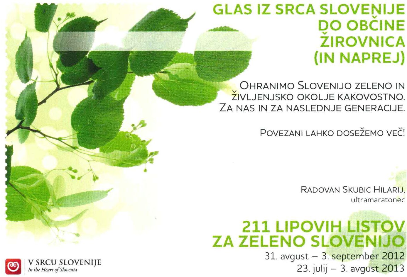 V sredo 24. julija 2013 smo pred Občino Žirovnica sprejeli ultramaratonca Radovana Skubica Hilarija, ki je hkrati ambasador zelenega povezovanja. Trenutno je sredi svojega edinstvenega poodviga in sicer, prekolesariti želi vse slovenske občine. Obiskal bo vsako občino in ji predal zeleno spročilo v obliki lipovega lista.