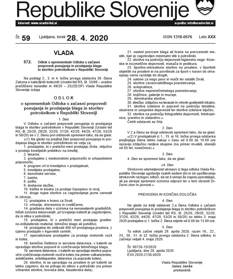 V vednost Odlok o spremembah odloka o začasni prepovedi ponujanja in prodajanja blaga potrošnikom v RS. Priporočamo dosledno spoštovanje preventivnih ukrepov. Smo veseli, da se življenje počasi vrača v normalne tirnice. Naša odgovornost je, da bo tako tudi ostalo.