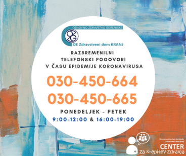 Pozdravljeni,ker smo se vsi skupaj znašli v obdobju, ki je s svojo negotovostjo izjemno neprijazno za marsikoga, vas želimo obvestiti o vzpostavitvi telefonskih linij v Centru za krepitev zdravja Zdravstvenega doma Kranj, ki so odprte za vse prebivalce.