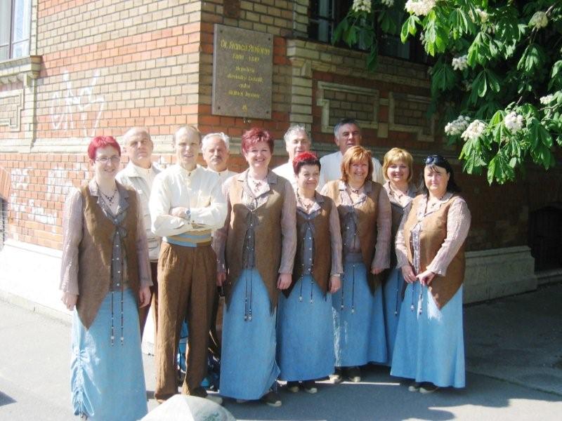 Prešernova ulica sredi Bratislave, pevci stojimo pod spominsko ploščo Dr. Franceta Prešerna, kjer piše da je bil največji slovenski pesnik in avtor državne himne