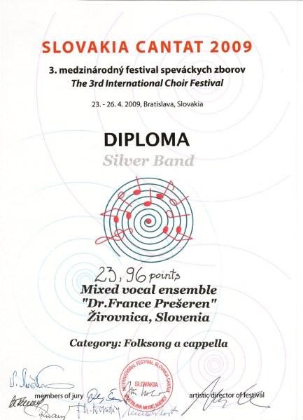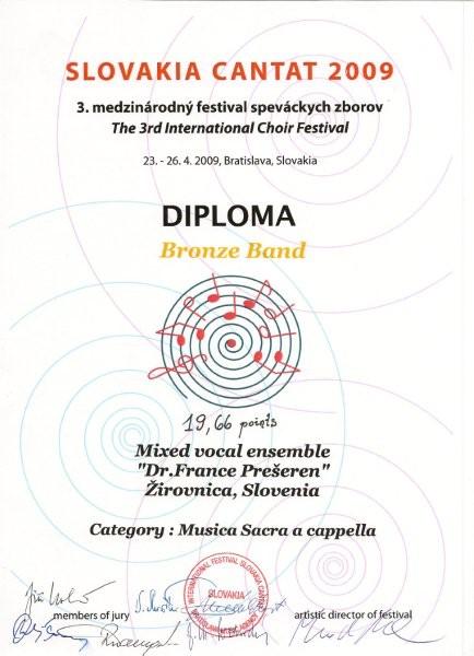 Prešernovci smo se v času od 23. do 26. aprila udeležili 3. mednarodnega zborovskega tekmovanja Slovakia Cantat 2009 v slovaški Bratislavi. Z veseljem smo se odzvali povabilu dr. Milana Kolena, direktorja festivala, ki smo ga prejeli lani po udeležbi na mednarodnem tekmovanju v Riminiju, kjer je gospod zasedal mesto v mednarodni žiriji. Za tekmovanje je bilo razpisanih 16 kategorij, mi smo se prijavili v dve, F1(ljudska pesem a cappella) in H (sakralna glasba a cappella). Registriranih je bilo 55 zborov iz 17 držav (Italije, Estonije, Poljske, Grčije, Bolgarije, Norveške, Madžarske, Rusije, Latvije, Danske, Hrvaške, Finske, Švedske, Češke, Srbije, Romunije, iz Slovenije nas je bilo prijavljenih kar 13), kar je pomenilo skupaj 1500 pevcev.