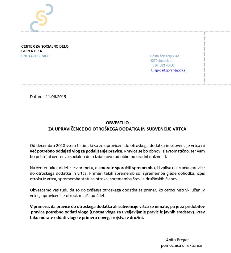 Uveljavljanje pravic iz javnih sredstev na Centru za socialno delo in obvestilo o otroškem dodatku in subvenciji vrtca