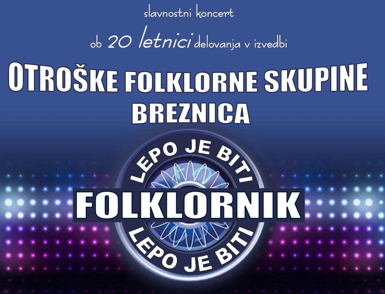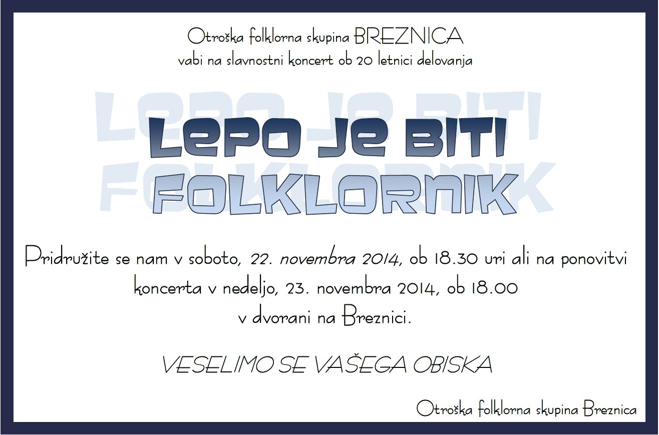 MLADI FOLKLORNIKI VAM SPOROČAMO, DA SMO NESKONČNO VESELI, KER NAS PODPIRATE V TAKO VELIKEM ŠTEVILU. SOBOTNI KONCERT “LEPO JE BITI FOLKLORNIK” JE ŽAL RAZPRODAN, VLJUDNO PA VABLJENI V DVORANO NA BREZNICI V NEDELJO, 23. NOVEMBRA OB 18. URI, DA Z NAMI PROSLAVITE ČASTEN JUBILEJ.