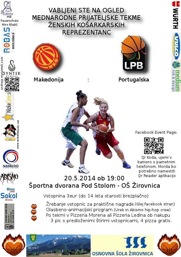 Vabimo Vas na ogled prijateljske košarkarske tekme med ženskima reprezentancama Portugalske in Makedonije, ki bo potekala dne 20.5.2014 ob 18:50h v športni dvorani Pod Stolom v OŠ Žirovnica.