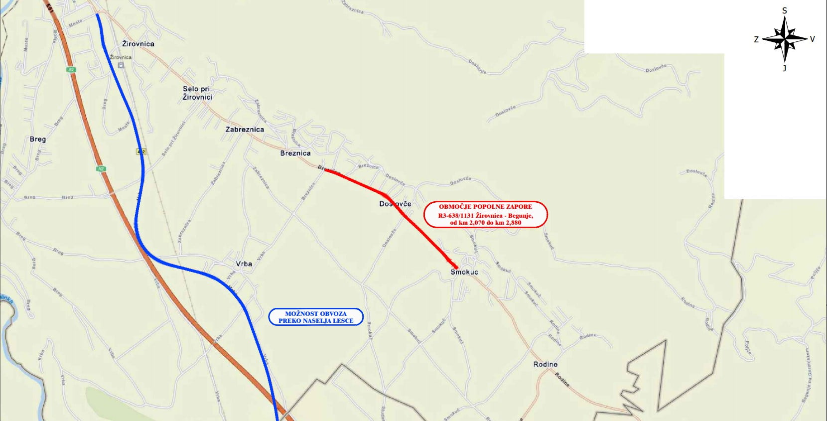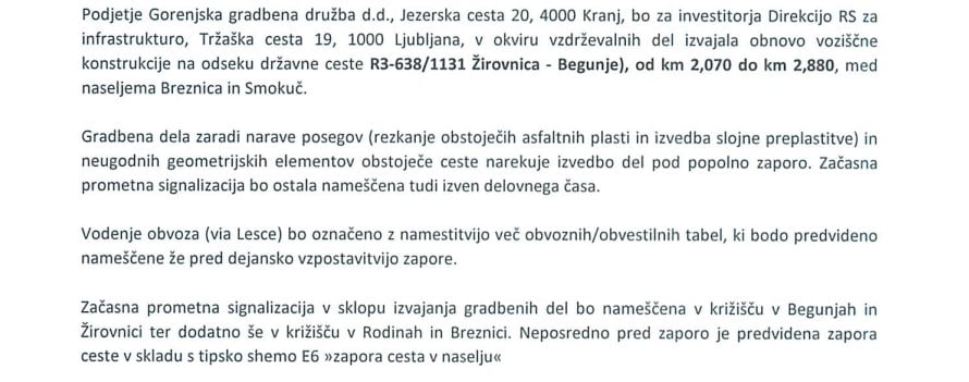 Zaradi tega bo cca. 14 dni spremenjen režim na relaciji Breznica-Smokuč. Cesta bo v času del zaprta. Uradni obvoz je na relaciji Žirovnica-rondo-Lesce-Hraše-Begunje-Rodine in obratno. Kljub temu bomo v tem času prekrili znake prepovedi vožnje na relaciji Rodine – cesarska cesta do križišča pri kapelici Vrba-Breznica, da vam olajšamo gibanje in dostop.