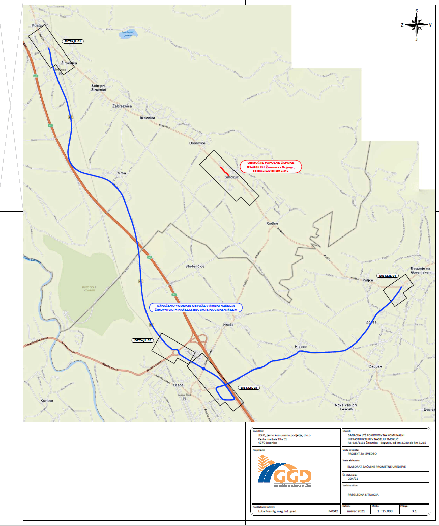 OZNAČENO VODENJE OBVOZA V SMERI NASELJA ŽIROVNICA IN NASELJA BEGUNJE NA GORENJSKEM
