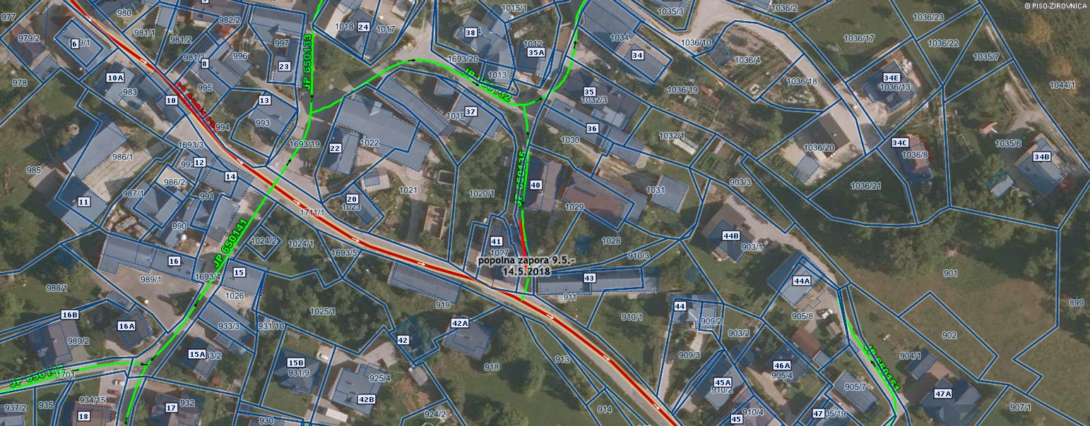 Knavs Rajko, Smokuč 41, 4274 Žirovnica, je dne 08.05.2018 zaradi obnove fasade na stanovanjskem objektu Smokuč 41, od srede, dne 09.05.2018, do ponedeljka, dne 14.05.2018, zaprosil za popolno zaporo kategorizirane občinske ceste s parc. št. 1693/19 k.o. Doslovče in oznako JP 650135, pri stanovanjskem objektu Smokuč 41. Popolna zapora na cesti bo trajala v času zapore vsak dan od 0.00 do 24.00 ure.