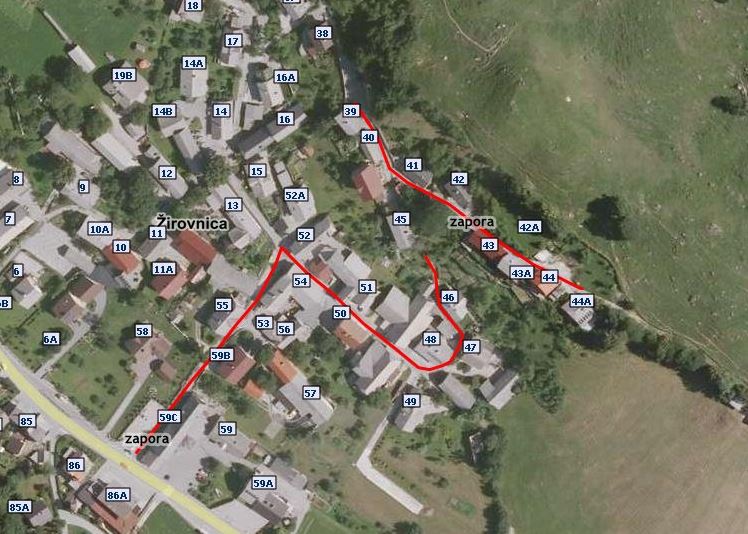 Občina Žirovnica dovoljuje Gorenjski gradbeni družbi d.d., Jezerska cesta 20, 4000 Kranj, zaradi gradnje fekalno kanalizacijskega omrežja ter obnove vodovoda, meteorne kanalizacije in javne razsvetljave v občini Žirovnica, v času med ponedeljkom, dne 23.03.2015 in torkom, dne 30.06.2015, v naselju Žirovnica popolno zaporo kategoriziranih občinskih cest z oznako JP 650072 (od objekta s hišno št. Žirovnica 54 do objekta s hišno št. Žirovnica 59c), JP 650073 (od objekta s hišno št. Žirovnica 45 do objekta s hišno št. Žirovnica 52) in JP 650074 (od objekta s hišno št. Žirovnica 39 do objekta s hišno št. Žirovnica 44a).