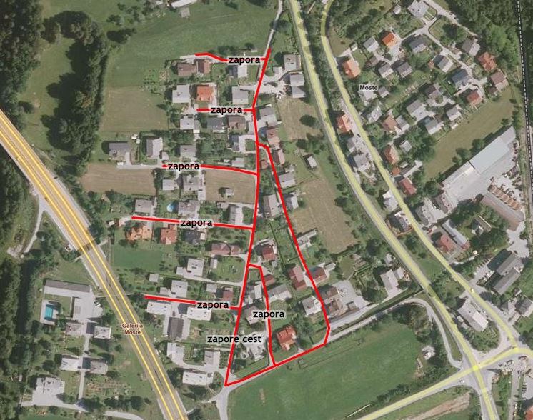 Občina Žirovnica dovoljuje VGP d.d., Ulica Mirka Vadnova 5, 4000 Kranj, zaradi gradnje fekalno kanalizacijskega omrežja v občini Žirovnica, od ponedeljka, dne 02.03.2015, do četrtka, dne 30.04.2015, v naselju spodnje Moste izmenične (oz. ob asfaltiranju v celoti) popolne zapore kategoriziranih občinskih cest z oznako: JP 650051, JP 650052, 650053, 650054, 650055, 650056, 650057, 650059 in 650043.