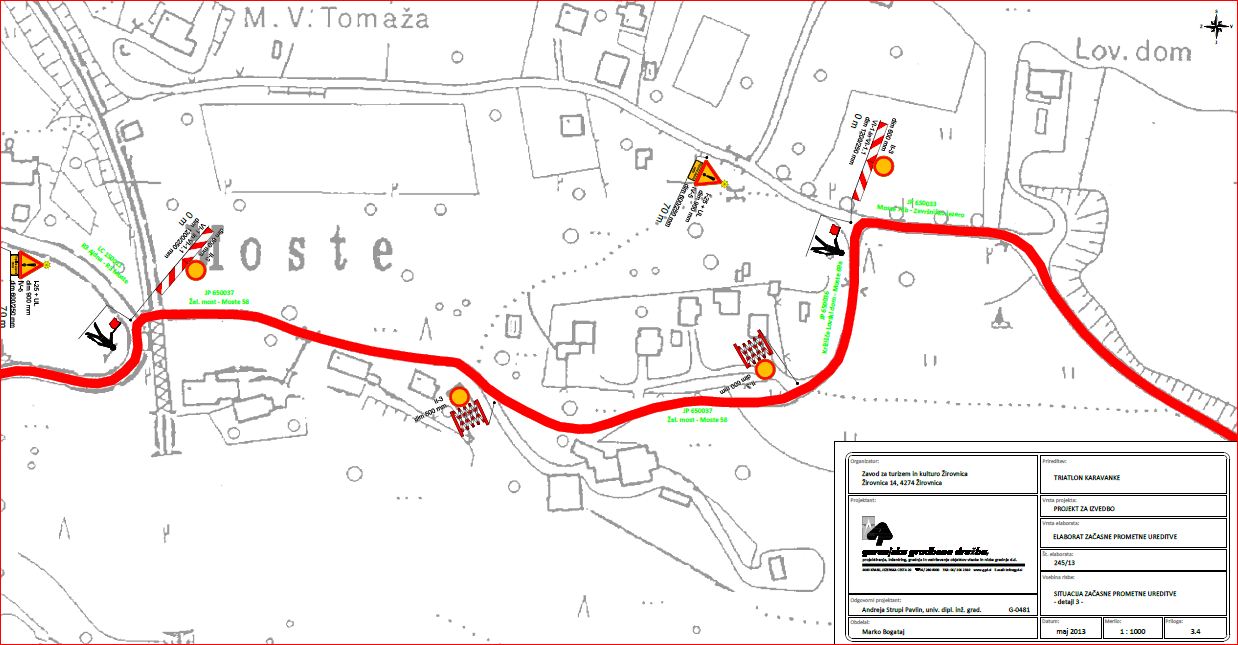 · popolne zapore občinskih cest morajo biti izvedene v skladu z izdelanim Elaboratom začasne prometne ureditve, št. 245/13 z dne 31.5.2013, ki ga je izdelala Gorenjska gradbena družba, d.d., Jezerska cesta 20, 4000 Kranj,