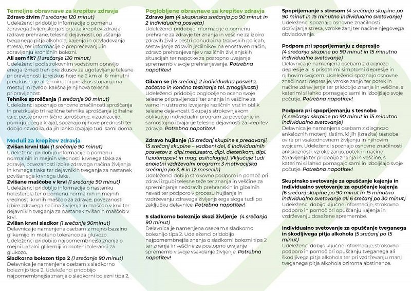 Program za krepitev zdravja je program skupinskih delavnic in individualnih svetovanj, kjer boste pridobili strokovne informacije, veščine in podporo za dolgotrajno spremembo življenjskih navad, ki bodo vodile do boljšega počutja in zdravja.