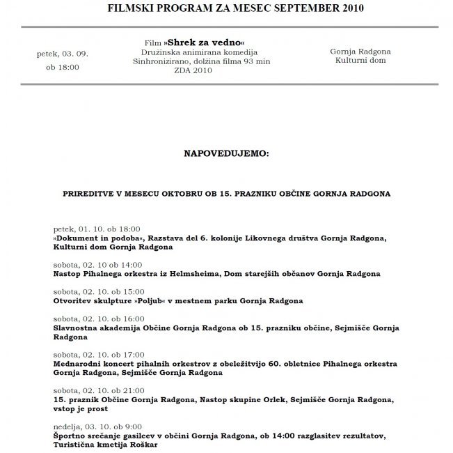 Koledar prireditev v mesecu septembru 2010 in filmski program kina v Gornji Radgoni