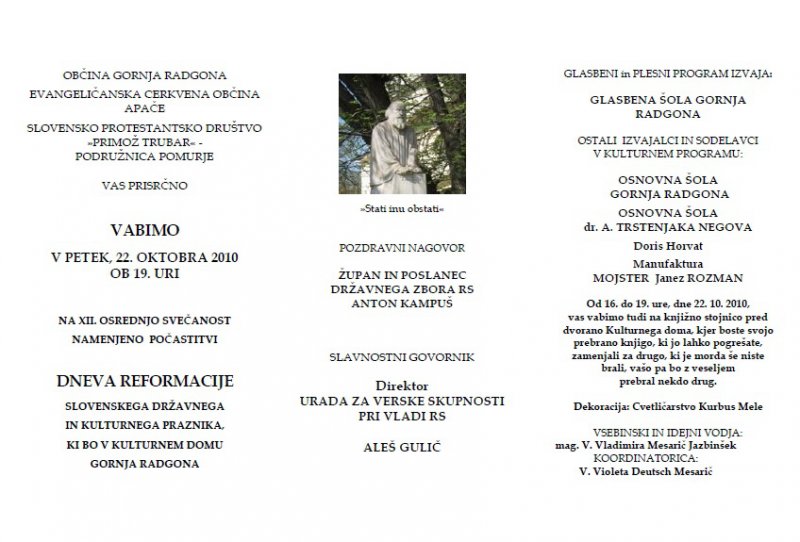 XII. osrednja svečanost namenjena počastitvi DNEVA REFORMACIJE, slovenskega državnega in kulturnega praznika - 22. oktobra 2010 v Kulturnem domu Gornja Radgona