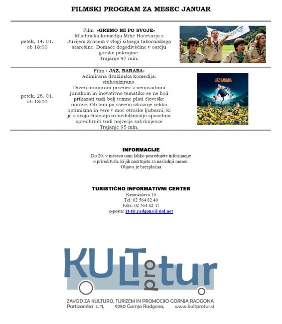 Prireditve, ki se bodo v mesecu januarju 2011 odvijale v občini Gornja Radgona in filmski program kina v Gornji Radgoni, so razvidne iz priponke spodaj: