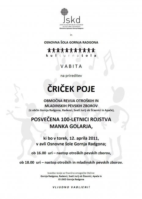 Prireditev ČRIČEK POJE: območna revija otroških in mladinskih pevskih zborov - posvečena 100-letnici rojstva Manka Golarja - 12. aprila 2011 v avli Osnovne šole Gornja Radgona